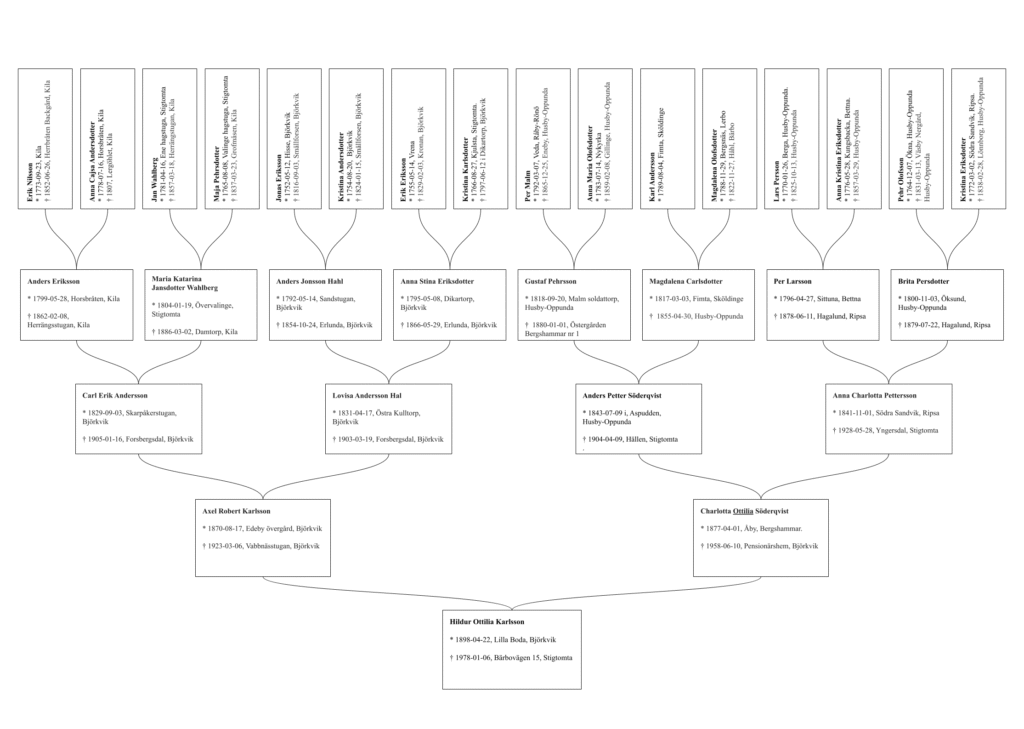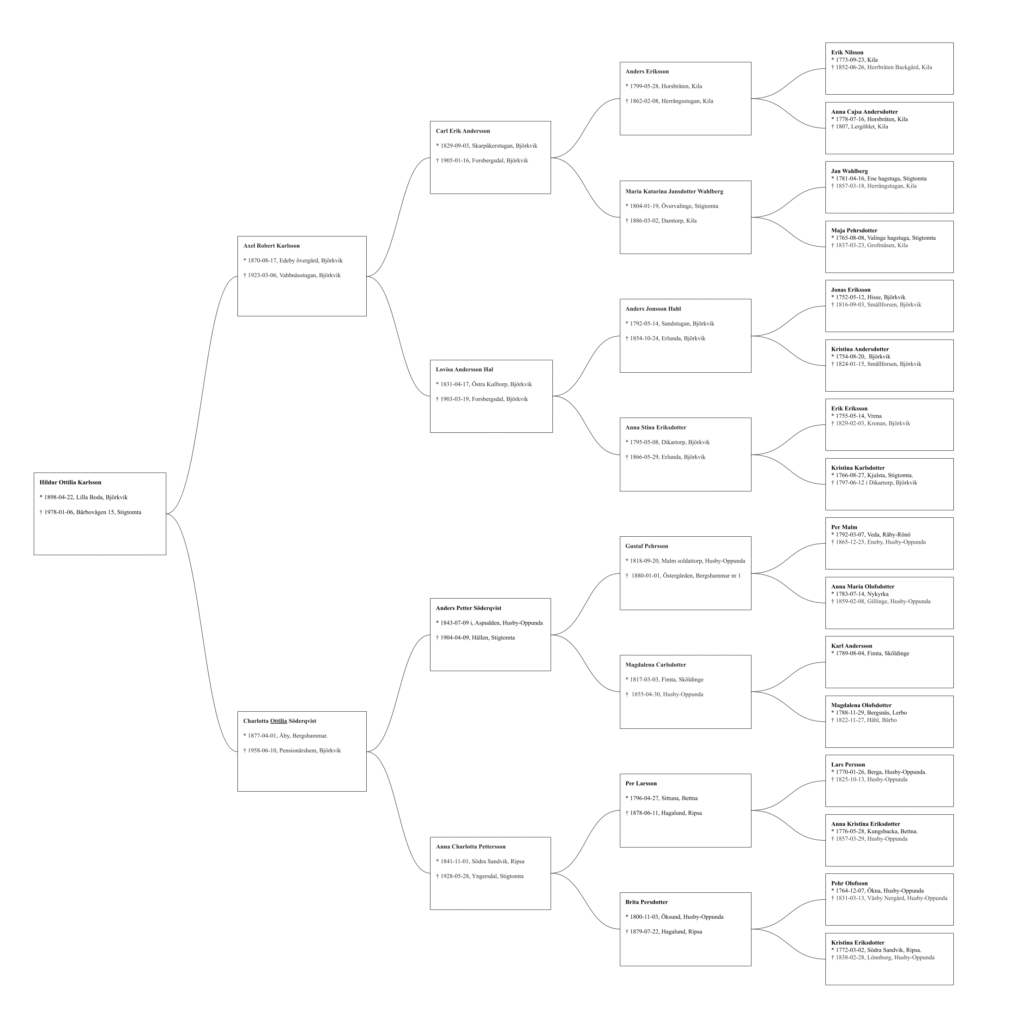 | 2 generationer bakåt | 6 personer | 600 kr | Släktträd + ansedel |